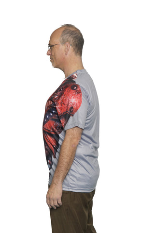 Your print will cover the entire t-shirt / The backside will be either white or black backed, your choice.